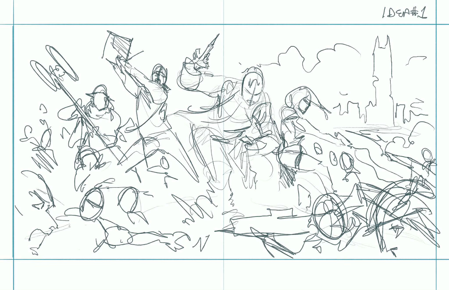 Concept 1: Heroes Surrounded. Heroes in group battle pose: Goose swinging the EM sensor pole, Anna using a taser, Rudy wielding a syringe, Rex swinging his laptop. Surrounded by militia and Travelers, everyone fighting; could include Dark Tower, balloon, militia vehicles, drones, flaming gas tanker truck. A nerd’s Mad Max.
